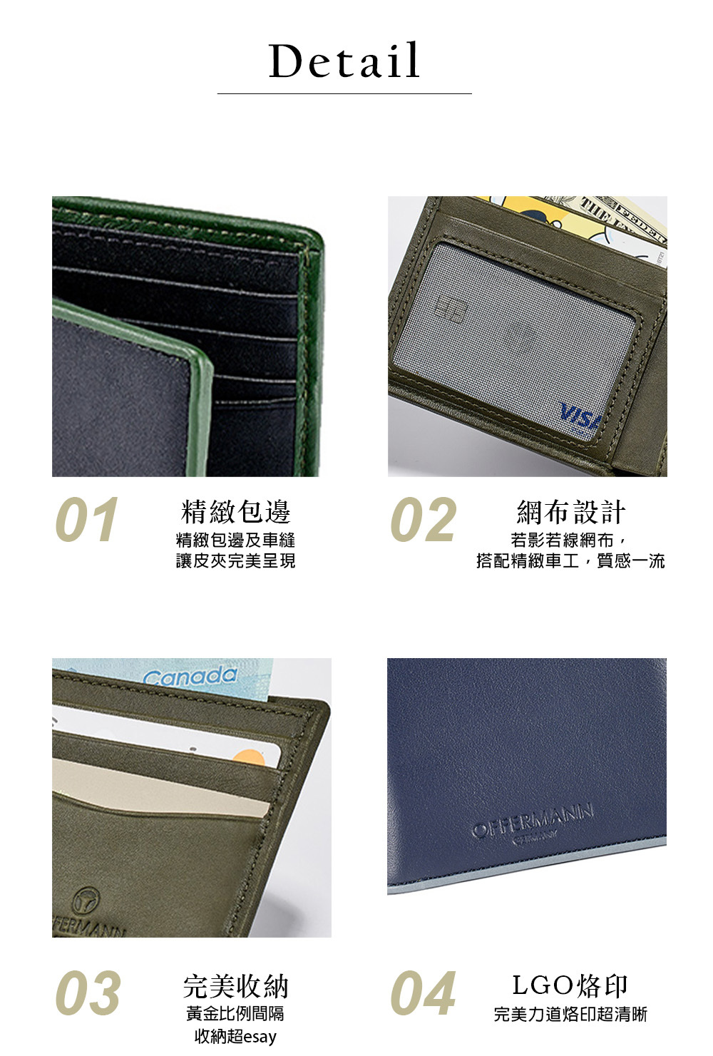 使用皮革為基礎,採用簡約大氣的設計,打造耐用的經典系列,V字型的卡格設計,卡片好抽取。
